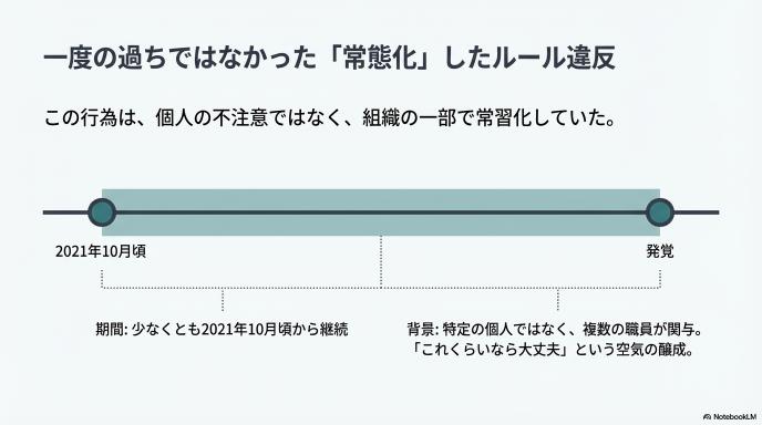 これがたった一度の出来事であれば、個人の不注意で済まされたかもしれません。しかし、調査によって明らかになったのは、この行為が少なくとも2021年の10月頃から続いていたという事実でした。特定の誰か一人だけではなく、20代から50代までの幅広い年代の看護師や介助職員が関わっていたことから、この「ルール破り」が一部の職員の間で「これくらいなら大丈夫だろう」という空気感とともに、当たり前のこととして共有されていた可能性が浮かび上がってきます。