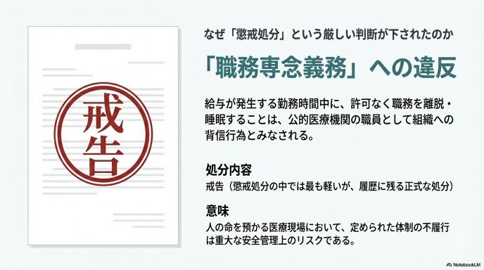 なぜそこまで厳しい対応が取られたのか。それは、この行為が公的な医療機関で働く職員としての「職務専念義務」に違反しているからです。給与が発生している勤務時間中に、許可なく職場を離脱したり睡眠をとったりすることは、組織に対する背信行為とみなされます。特に人の命を預かる医療現場において、決められた体制が守られていない状況は、安全管理上の大きなリスクになり得るのです。