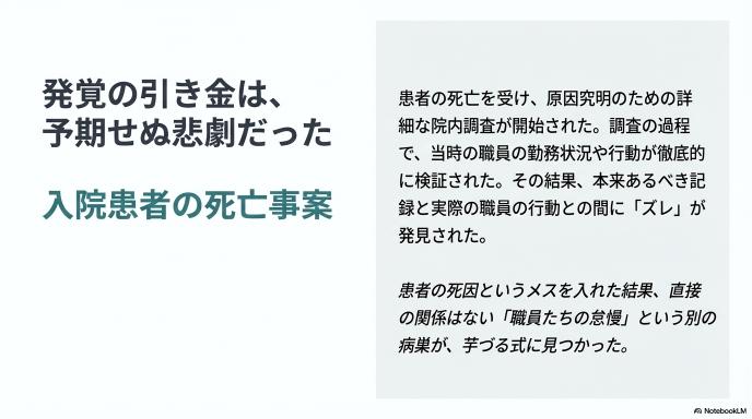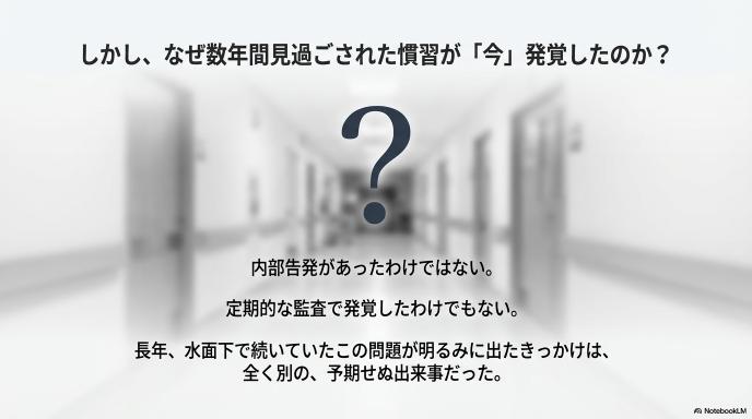 長期間にわたって見過ごされてきた「過剰な仮眠」が発覚したきっかけは、内部告発でも定期的な監査でもありませんでした。それは、病院内で起きた入院患者の死亡事案という、痛ましい出来事の調査だったのです。