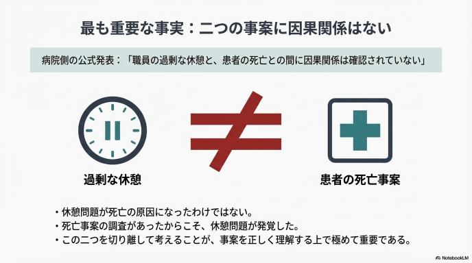 ここで、ニュースを読む私たちが最も冷静に受け止めなければならない点があります。それは、病院側が「職員の過剰な休憩と、患者の死亡との間に因果関係は確認されていない」と明確に発表していることです。