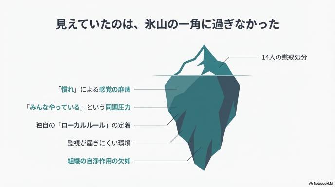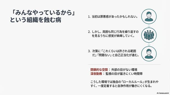 今回のニュースが私たちに投げかけているのは、単なる医療従事者の不祥事という話にとどまりません。組織の中で一度「ルールの緩み」が生まれると、それが修正されることなく、いかに広がりやすいかという教訓です。