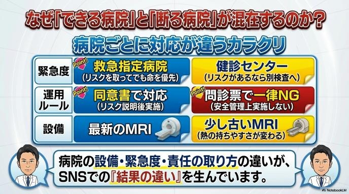 このように、病院が持っている設備、検査の緊急度、そして安全管理のルールの違いによって対応は大きく分かれます。「日本の病院は対応がバラバラだ」と感じるかもしれませんが、それぞれの病院が患者さんの安全を第一に考えた結果として、ルールに違いが生まれているのです。