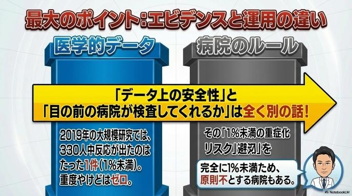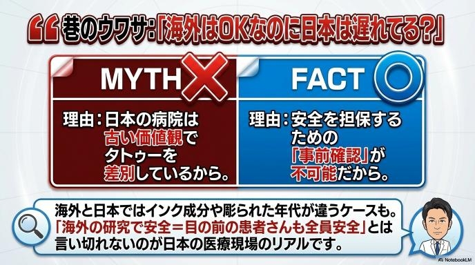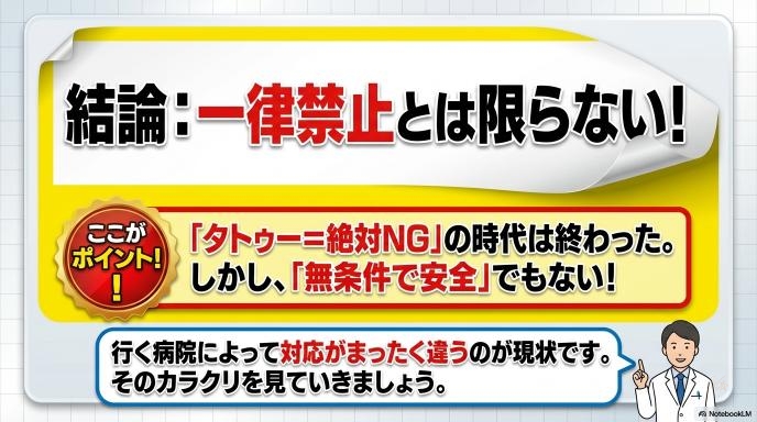 いくら研究データで安全性が示されていても、その研究は「体表面積の5%を超えるような巨大なタトゥー」や「顔や頭のタトゥー」などを除外して調べられたものです。すべての人の、どんなタトゥーに対しても100%安全と言い切れるデータは、まだ世界中のどこにもありません。医療機関は患者さんの体を守る責任があるため、「少しでも危険があるなら慎重にならざるを得ない」というのが現場のリアルな声なのです。