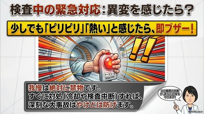 「言ったら断られるかもしれないから」と、問診票で嘘をついたり、当日に隠したまま検査を受けたりするのは絶対にやめてください。検査中に熱感ややけどが起きた場合、すぐに対処できず大事故につながる恐れがあります。また、検査中は少しでもピリピリとした刺激や熱さを感じたら、すぐにナースコール(手元のブザー)を鳴らすことが身を守るためにもっとも重要です。