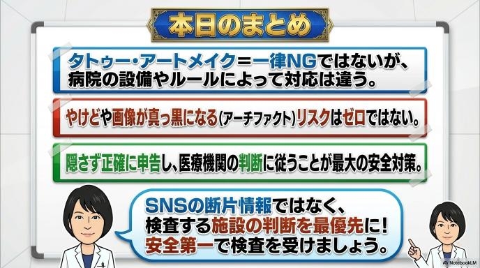 日本国内の学会(日本磁気共鳴医学会など)のガイドラインでも、「検査前にタトゥーの有無をしっかり把握し、やけど等の恐れがあるものを適切に管理する」という方針が示されています。つまり、頭ごなしにダメと言うのではなく、注意しながら行いましょうという考え方が基本になりつつあります。