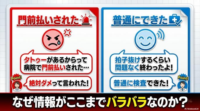 X(旧Twitter)などのSNSを見ていると、タトゥーとMRIに関する情報は本当にバラバラです。ある人は「病院で門前払いされた」と不満をこぼし、別の人は「拍子抜けするくらい問題なく終わった」と安心しています。この違いは一体どこから来るのでしょうか。