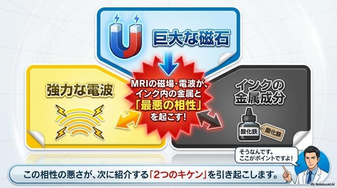 では、そもそもなぜタトゥーやアートメイクがMRI検査で問題視されるのでしょうか。MRIは、巨大な磁石と強力な電波を使って体の中の断面図を撮影する機械です。この「磁石と電波」が、皮膚に入っている色素(インク)と相性が悪いことがあるのです。具体的に気をつけるべき3つのポイントを見ていきましょう。