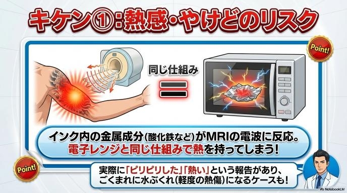 MRIの強力な電波を体に当てると、インクの中の金属成分が反応して、電子レンジと同じような仕組みで熱を持ってしまうことがあります。「検査中にタトゥーの周りがピリピリした」「熱く感じた」といった報告は実際にあり、ごくまれですが水ぶくれのような軽い熱傷(やけど)になるケースも報告されています。