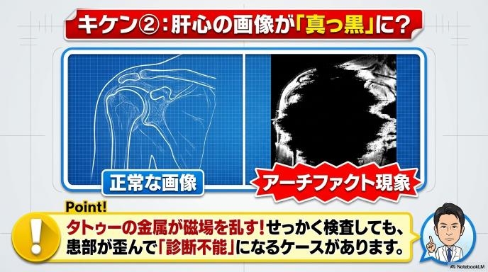 もう一つ、医療側が困ってしまうのが「画像の乱れ(アーチファクト)」です。インクの金属成分がMRIの磁場を乱してしまうため、タトゥーが入っている部分の周辺の画像が、黒く抜けたり歪んだりして使い物にならなくなることがあります。