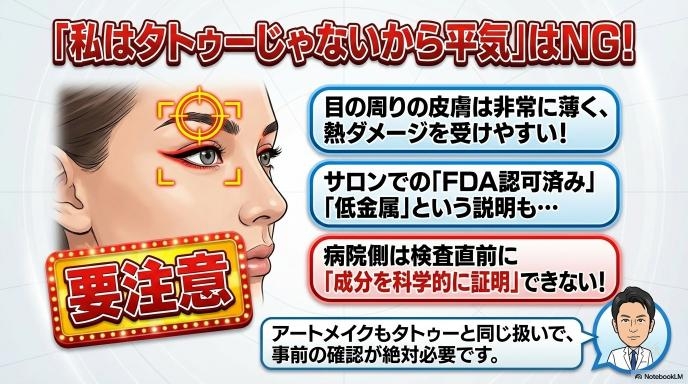 特にアイラインのアートメイクは注意が必要です。目の周りの皮膚は非常に薄くデリケートなため、少しの熱でもダメージを受けやすいからです。「私のサロンのインクはFDA認可済みで金属が少ないから大丈夫と言われた」という方もいますが、検査の直前に病院側がその成分を科学的に証明することは不可能なため、自己申告だけで「じゃあ安全ですね」と判断することはできないのです。