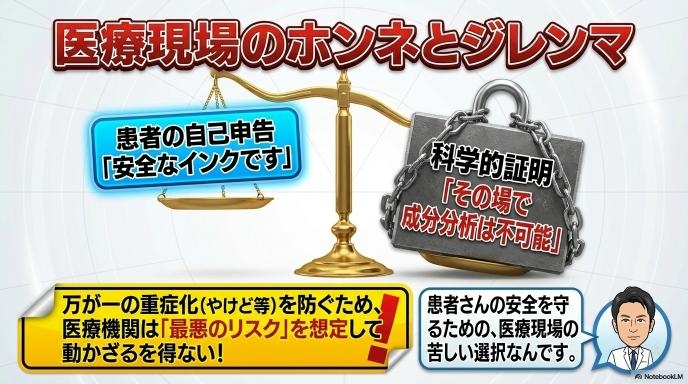 | インク成分の不明確さ | 患者側が「安全な染料」と認識していても、医療機関側が検査直前に成分を科学的に証明できないため。 | 「隠さないこと」が鉄則。問診票で正確に申告し、施設のルールと医師の判断に従う。 |