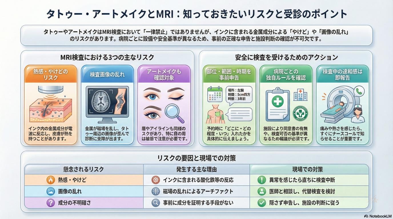 もしあなたやご家族がタトゥーやアートメイクを入れていて、これからMRI検査を受ける可能性がある場合、トラブルを防ぐためにいくつか押さえておきたいポイントがあります。