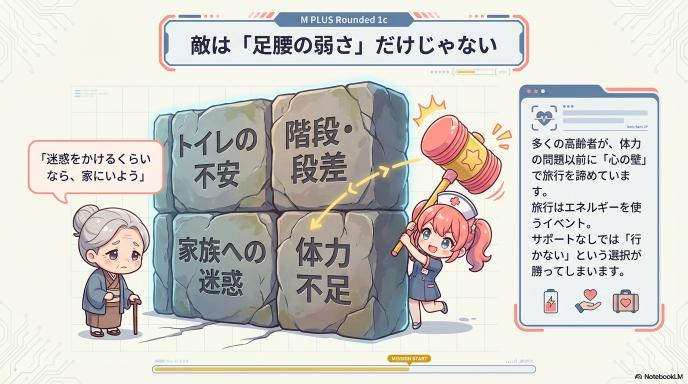 「旅行に行きたい気持ちはあるけれど、周りに迷惑をかけるくらいなら家にいる」 そんな風に、体力や足腰の衰えを理由に旅行を諦めてしまう方は非常に多くいらっしゃいます。旅行は楽しい反面、移動や環境の変化が伴うため、実はとてもエネルギーを使うイベントです。しかし、適切なサポートの仕組みさえあれば、その「無理」という前提は大きくひっくり返ります。