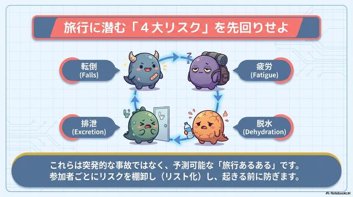 楽しい旅行の裏側には、医療職ならではのシビアな視点での「リスク管理」が必ずセットになっています。「楽しかったね」で無事に帰ってくるためには、起きうるトラブルを事前に想像し、現場でどう手当て(対応)するかというシナリオをどれだけ持っているかが勝負の分かれ目です。