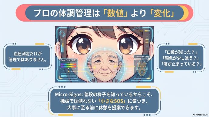 「この段差は、こういう角度で車いすを進めれば安全に越えられる」(理学療法士の視点) 「少し顔色が疲れているから、今のうちに水分補給をして日陰で休もう」(看護師の視点)