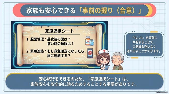 安全な旅行のためには、ご家族との連携も欠かせません。旅行中の「お薬の管理」はその代表例です。 お昼ご飯の後に飲むお薬はもちろん、「痛みが強い時だけ飲むお薬(頓用・とんよう)」をどうするかも、事前にご家族としっかり打ち合わせをします。さらに、「もし万が一、現地で体調が急変して救急車を呼ぶことになったら、どこに連絡するか」「その際の保険はどうなっているか」といったデリケートな部分も、同意書などを交わして事前にクリアにしておきます。この「家族説明の型」がしっかりしているからこそ、ご家族も「プロに安心してお任せしよう」と快く送り出してくれるのです。
