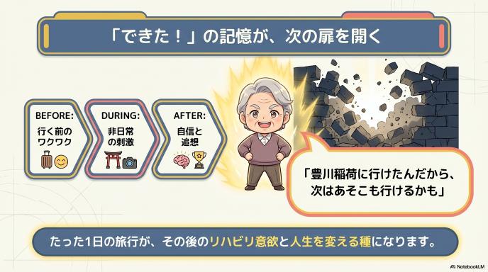 このような「できた!」という成功体験は、何よりも強力なリハビリテーションです。一度「無理だ」と思い込んでいた壁を越えると、ご本人の心の中に「次はあそこにも行ってみたい」「もう少し歩く練習をしてみようかな」という、前向きな意欲が生まれます。たった一回の旅行が、その後の生活を大きく変えるきっかけ(=次の外出を連れてくる種)になるのです。