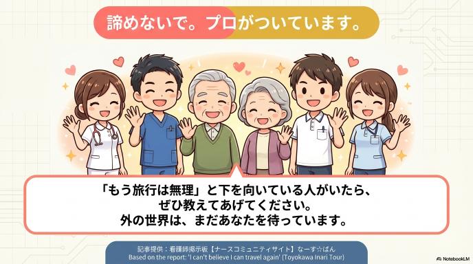 病気や年齢を理由に、社会から孤立してしまう高齢者の方々。彼らを再び社会と繋ぎ、その人らしい笑顔と役割を取り戻すための最強のツールが「旅行」なのです。 「もう旅行は無理」──もし、あなたの身近な人がそう言ってうつむいていたら、ぜひ「こんなサポートがあるんだよ」と、この記事のことを伝えてあげてください。きっと、また新しい景色を見に行くための、希望の第一歩になるはずです。