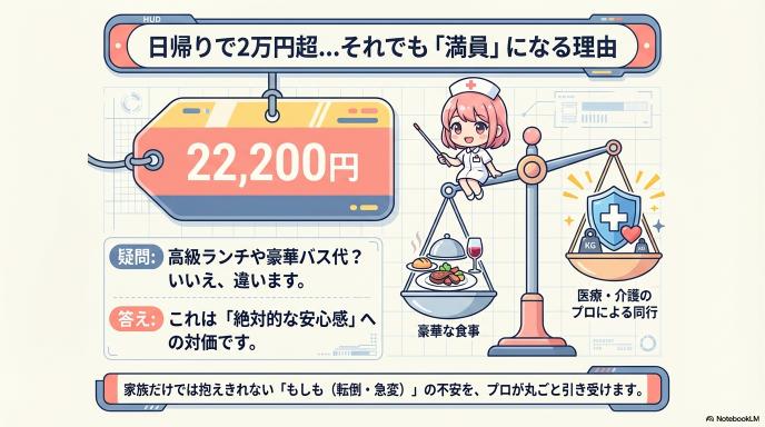 その理由は、ずばり「安心感」です。高齢の親を旅行に連れて行きたいけれど、「もし出先で転んで骨折したら」「急に具合が悪くなったらどうしよう」という不安から、ご家族だけで連れ出すのは非常にハードルが高いのが現実です。このツアーでは、その「もしも」の不安を医療と介護のプロフェッショナルが丸ごと引き受けます。ワクワクする体験の土台には、何よりもまず「絶対に安全に帰ってこられる」という確固たる安心が敷き詰められているのです。