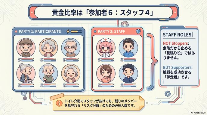 現場のリアルな視点でお話しすると、この「6対4」という比率は決して過剰ではありません。例えば、参加者のお一人が「トイレに行きたい」となった場合、車いすの移動や排泄の介助でスタッフが1〜2名付き添います。その間、残りの参加者の方々が安全に待機できるよう、別のスタッフが見守る必要があります。さらに、急な体調不良や転倒のリスクにも即座に対応できるよう、余裕を持った人員配置(リスク分散)がどうしても欠かせないのです。