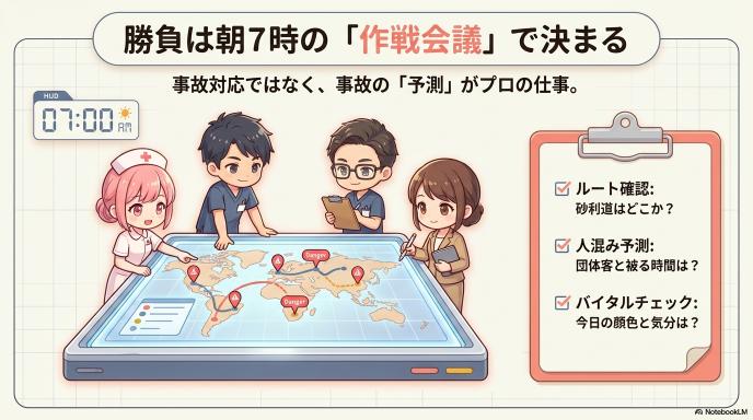 観光地には、「道が狭い」「砂利道がある」「この時間は団体客で混雑する」といった危険なポイントがたくさん潜んでいます。医療や介護の現場では、事故が起きてから対処するのではなく、事故が起きそうな場所を「予測」して事前に避けることが鉄則です。どこでトイレ休憩を挟むか、どのルートを通れば車いすが安全に進めるか。この朝の時点で、リスクの芽を徹底的に摘み取っておくのです。