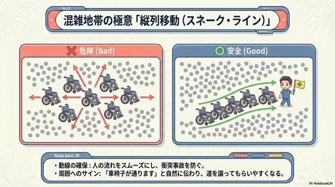 なぜ縦列が良いのでしょうか?横に広がると、一般の観光客とぶつかる危険性が高まり、スタッフの目も行き届きにくくなります。しかし、一番前と一番後ろにスタッフを配置し、その間に参加者の車いすが一列に並んで進むことで、安全な「動線(人の動く道筋)」を確保できます。さらに、周囲の人にも「車いすの団体が通る」ことが伝わりやすくなり、自然と道を譲ってもらいやすくなるというメリットもあります。ちょっとした工夫ですが、これが事故率を劇的に下げるプロのテクニックなのです。
