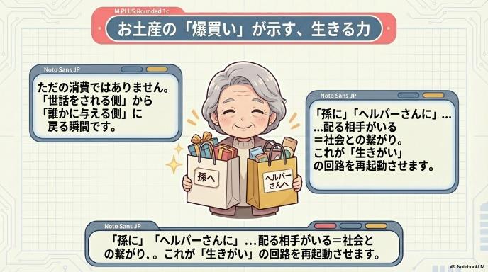 観光地に行くと、お土産屋さんを見て回るのも楽しいですよね。このツアーでも、参加者の方々がお土産をたくさん買う姿(いわゆる“爆買い”)が見られます。でも、これはただお金を使っているだけの単なる消費ではありません。その裏には、高齢の方にとってのとても大切な心理が隠されています。